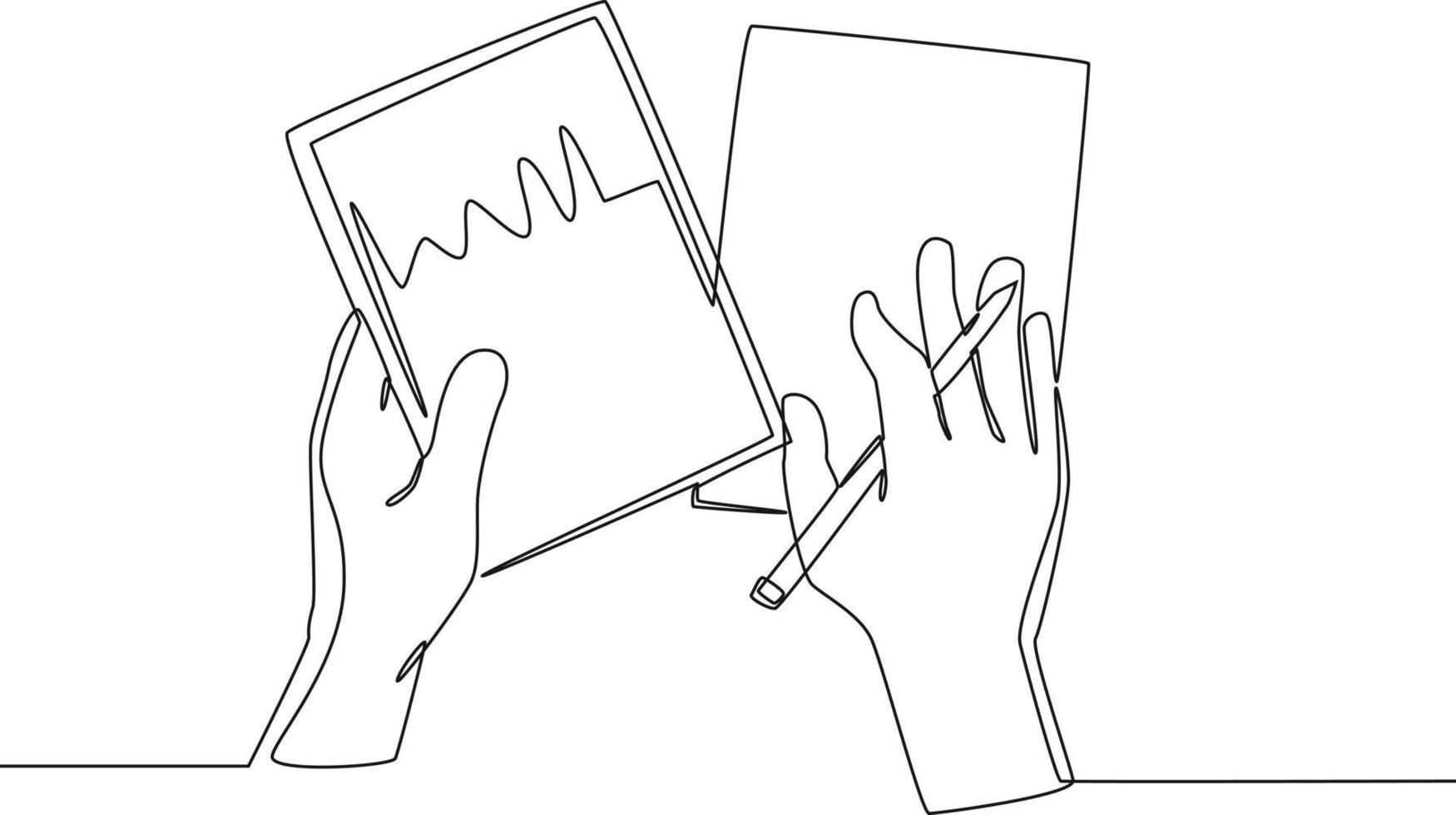 Single one line drawing businessman use pen to write data result from tablet in note. Working big data concept. Continuous line draw design graphic vector illustration. Pro Vector