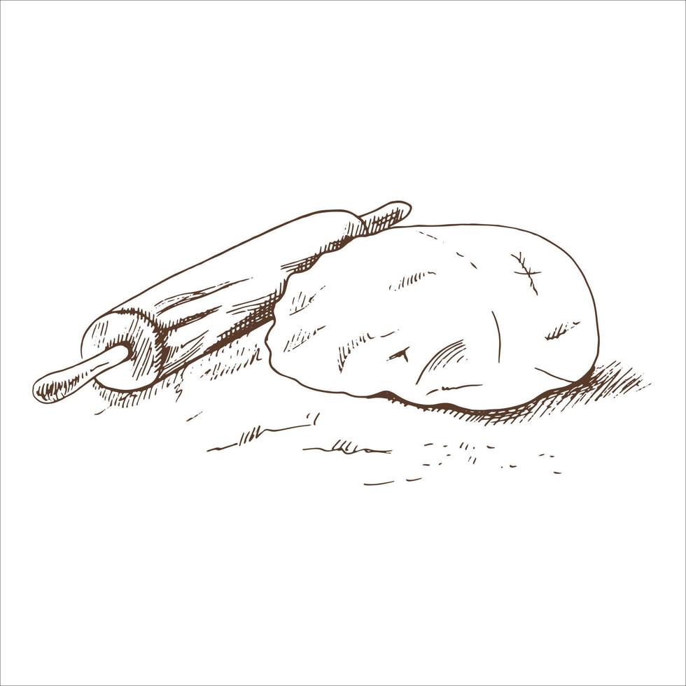 Vector hand drawn illustration of dough, rolling pin and flour. Brown and white pastry drawing isolated on white background. Sketch icon and bakery element for print, web, mobile and infographics. Pro Vector