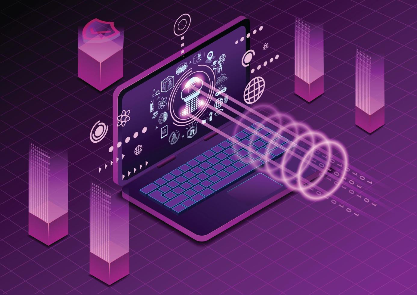 Realistic notebook mock up and Metaverse icons on screen.It's metaverse data concept. Pro Vector