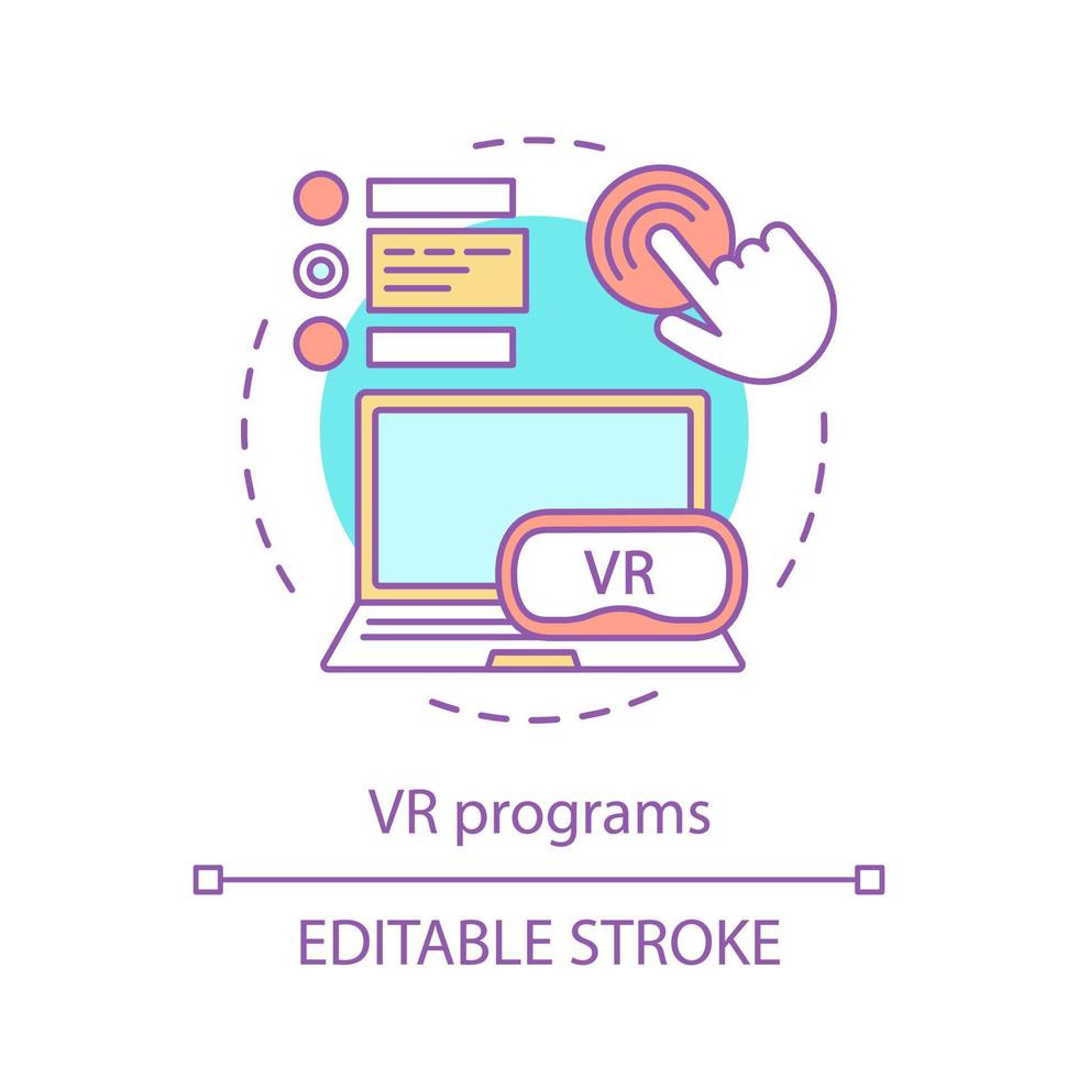 VR programs concept icon. Development VR software. AR technologies. Virtual reality platform idea thin line illustration. Vector isolated outline drawing. Editable stroke Pro Vector