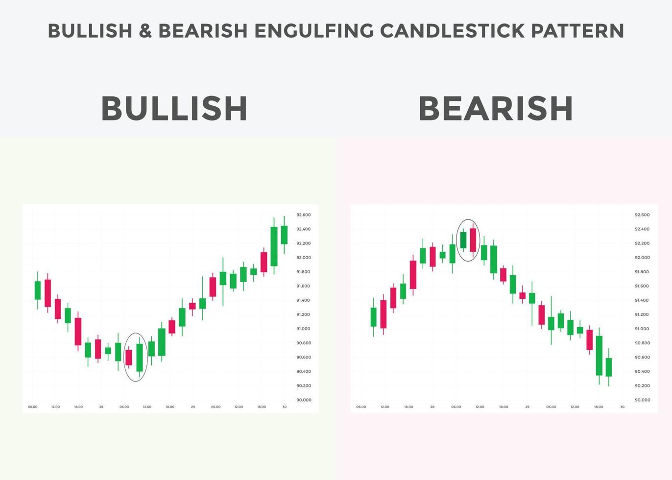 best candlestick patterns for forex, stock, cryptocurrency trades. Bullish and bearish engulfing candlestick pattern. Bullish and bearish candlestick chart patterns. candlestick chart analysis. Pro Vector