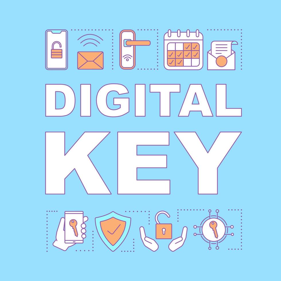 Digital key word concept banner. Wireless, keyless padlock. NFC smart door lock. Remote control hotel padlock. Presentation, website. Isolated typography with linear icons. Vector outline illustration Pro Vector