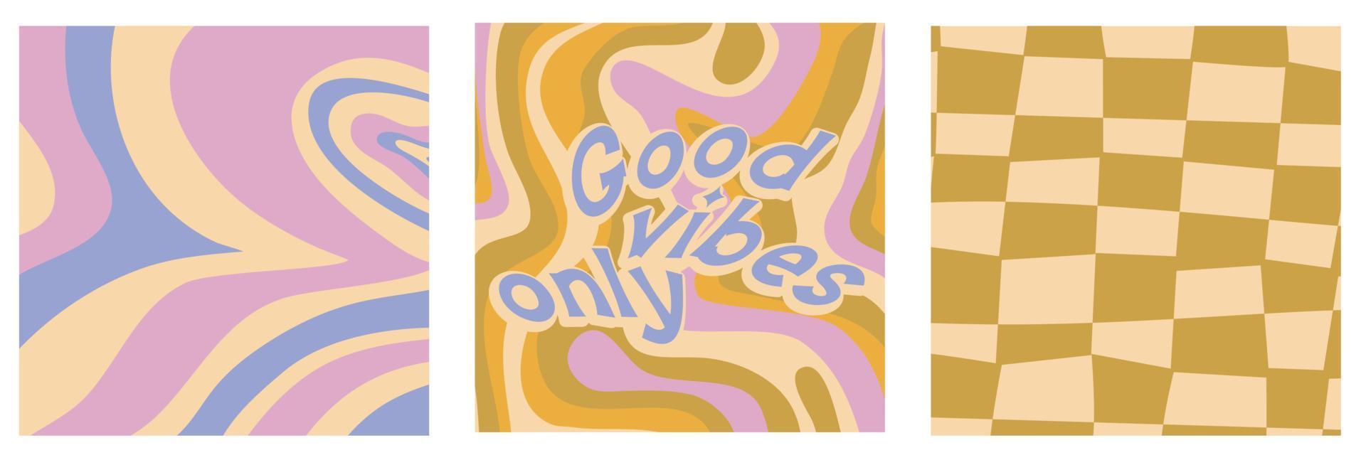 Set groovy retro poster with flower, quotes and abstract. Hippie slogan good vibes only and psychedelic background in set. Retro groovy vector illustration. Pro Vector