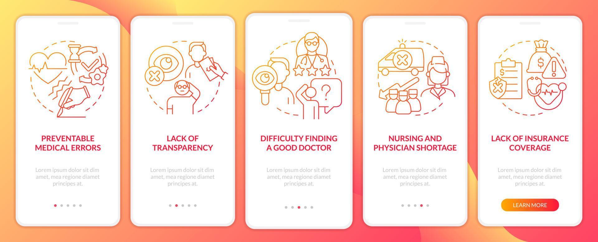 Current healthcare problems red gradient onboarding mobile app screen. Walkthrough 5 steps graphic instructions pages with linear concepts. UI, UX, GUI template. Pro Vector
