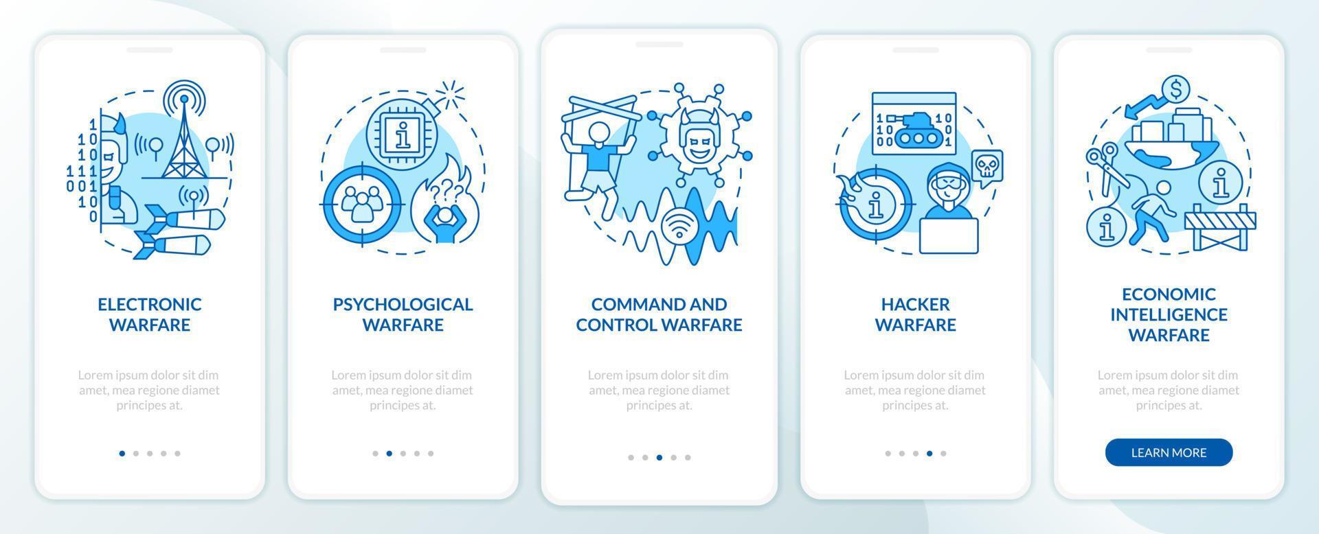 Subareas of information warfare blue onboarding mobile app screen. Walkthrough 5 steps graphic instructions pages with linear concepts. UI, UX, GUI template. Pro Vector