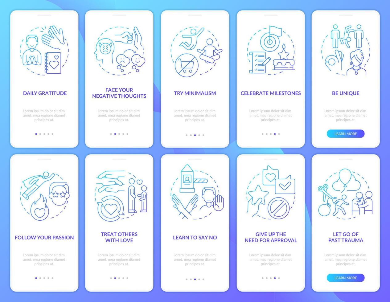 Personal mental wellness blue gradient onboarding mobile app screen set. Walkthrough 5 steps graphic instructions pages with linear concepts. UI, UX, GUI template. Pro Vector