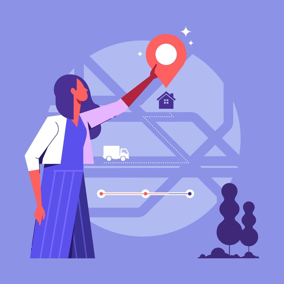Woman set pick up location in Mobile delivery app, online order and delivery process. Mobile delivery concept Pro Vector