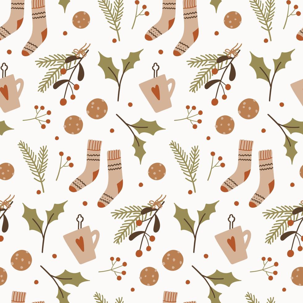 Retro seamless pattern with fir tree branches, socks, twigs, berries, cocoa cup and cookies. Pro Vector