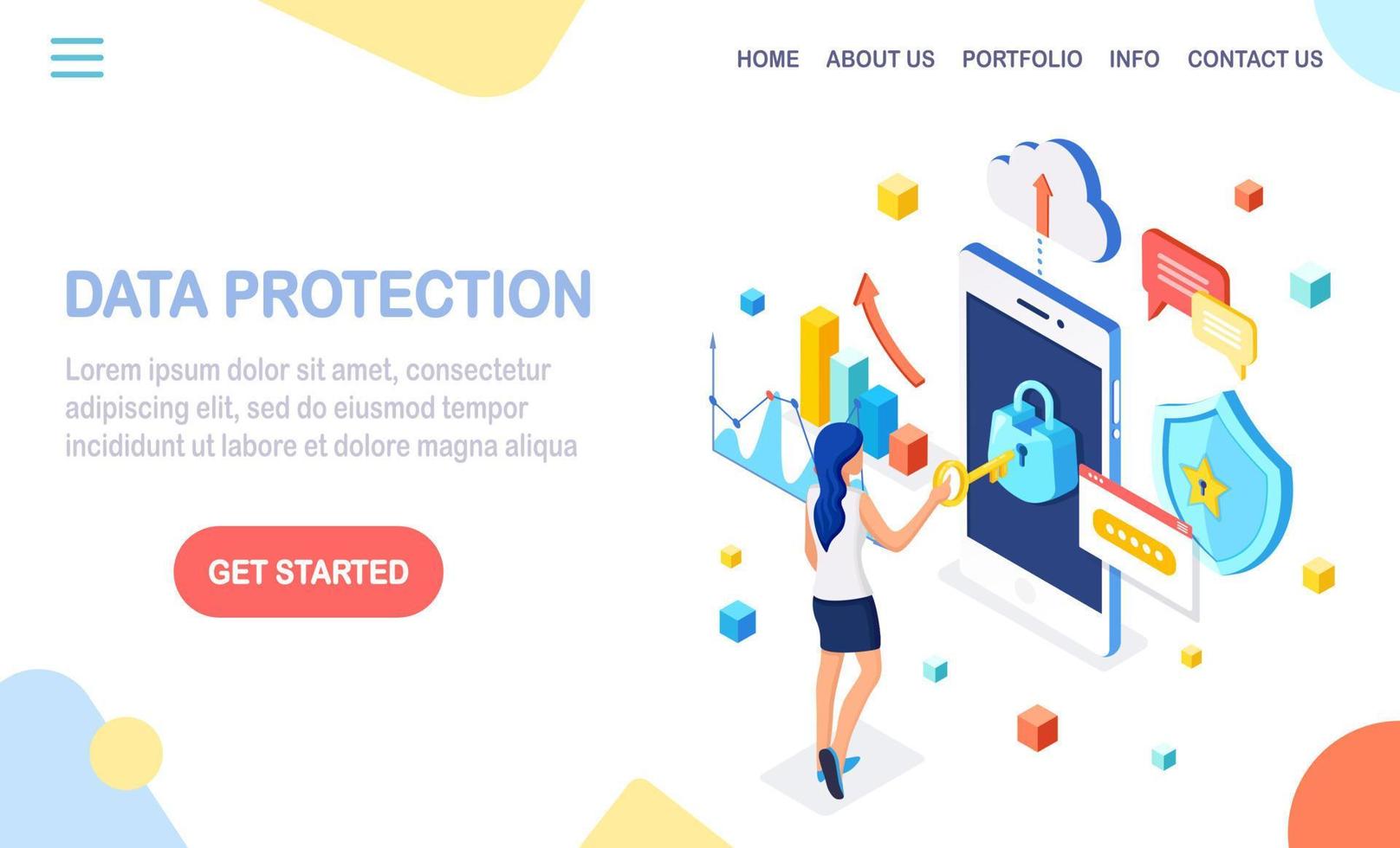 Data protection. Internet security, privacy access with password. Isometric woman, phone with lock Pro Vector