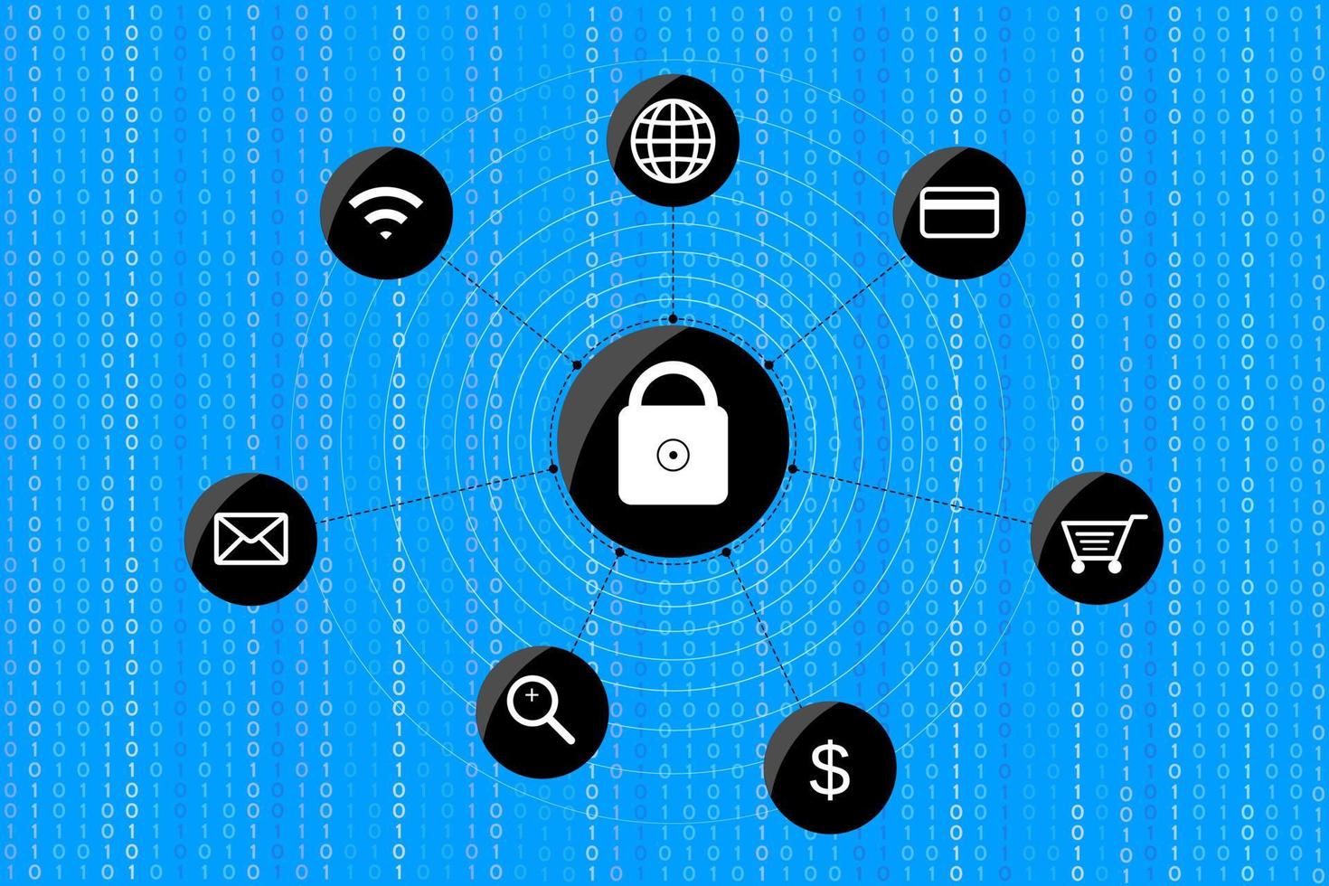 Cybersecurity data protection concept. Icons related to online data network protection on binary code background Pro Vector