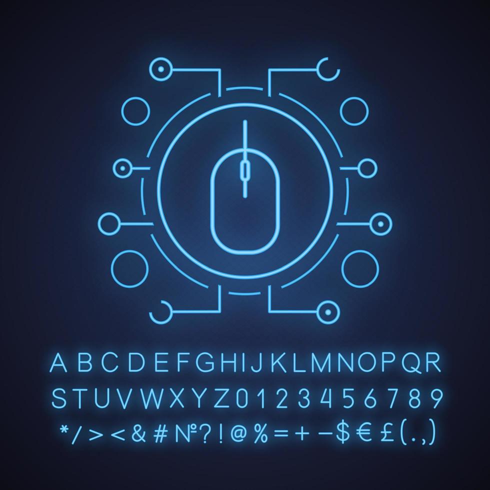 Computer mouse neon light icon. Digital management. Computer hardware. Glowing sign with alphabet, numbers and symbols. Vector isolated illustration Pro Vector