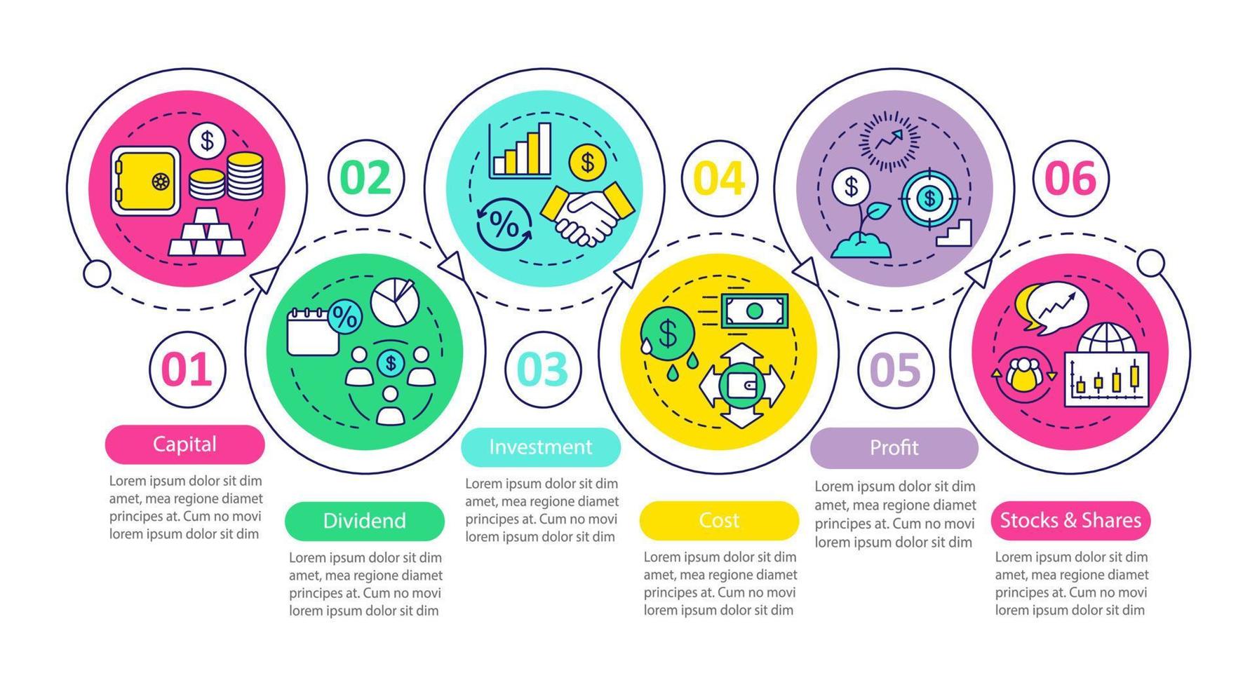 Business vector infographic template. Capital, dividend, investment, cost, profit, stocks and shares. Data visualization with six steps and options. Process timeline chart. Workflow layout with icons Pro Vector