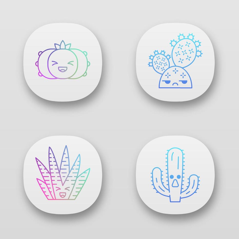 Cactuses app icons set. Plants with smiling faces. Laughing peyote and zebra cactuses. Unamused prickly pear wild cacti. UI UX user interface. Web or mobile applications. Vector isolated illustrations Pro Vector