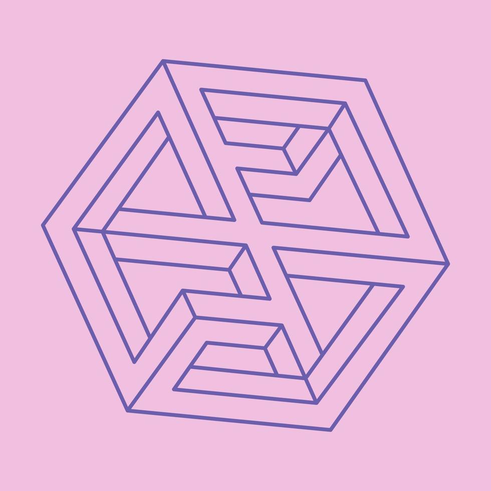 Optical illusion. Impossible shapes. Sacred geometry figure. Abstract eternal geometric objects. Impossible endless outline. Optical art. Impossible geometry shape on a pink background. Pro Vector