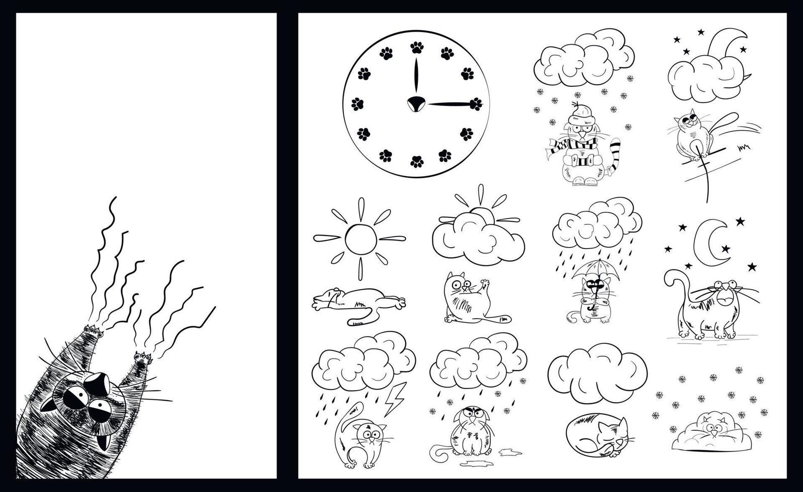 Cat on a white background. Theme for smartphone. Background for the main screen, a watch dial with paw prints and weather icons made in the mood of a cats. Cat weather. Vector illustration. Pro Vector