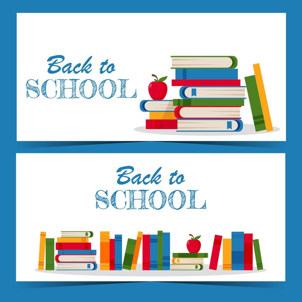 Back to school horizontal banner design with stack of colourful books and red apple on white background. Pro Vector