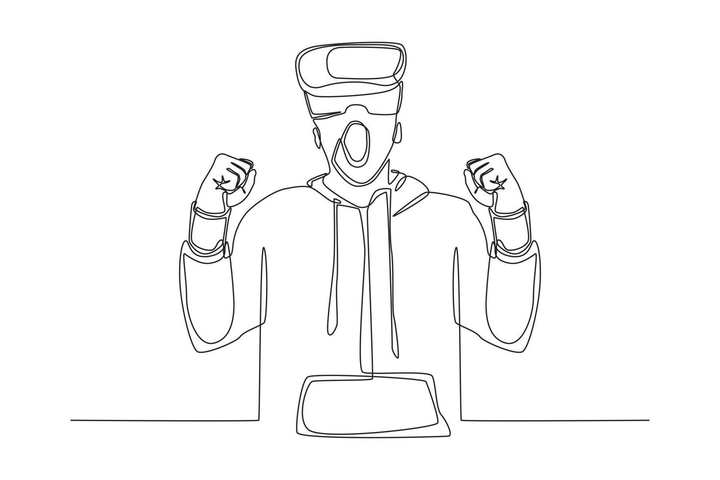 One continuous line drawing of happy young man when he plays virtual reality as winner. Virtual game concept. Single line draw design vector graphic illustration. Pro Vector