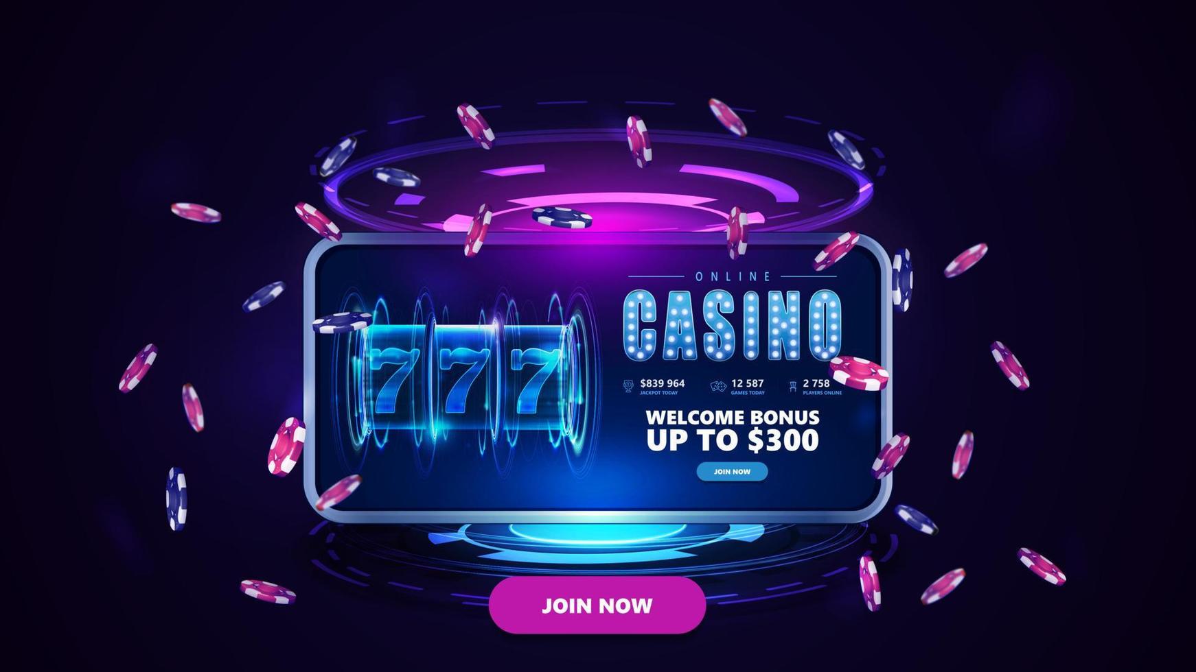 Invitation web banner with button, smartphone with slot machine on screen and poker chips in scene with hologram of digital rings Pro Vector
