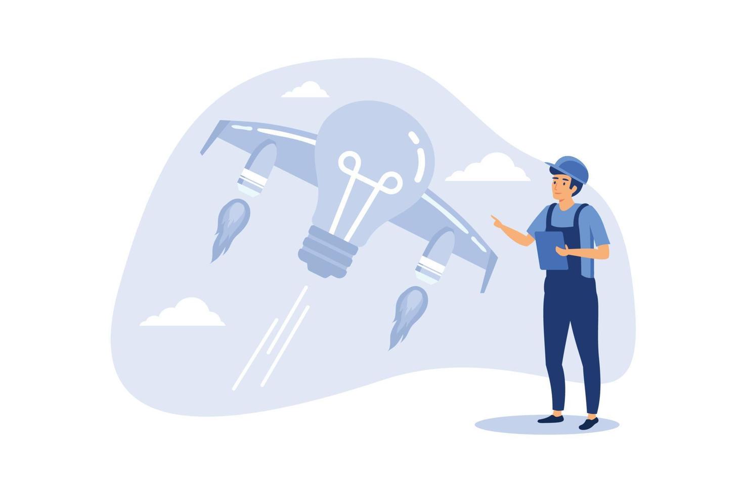 Boost creative idea, imagination, innovation or technology to help success, invent new solution to win business competition concept, bright lightbulb idea with rocket booster flying fast into the sky. Pro Vector