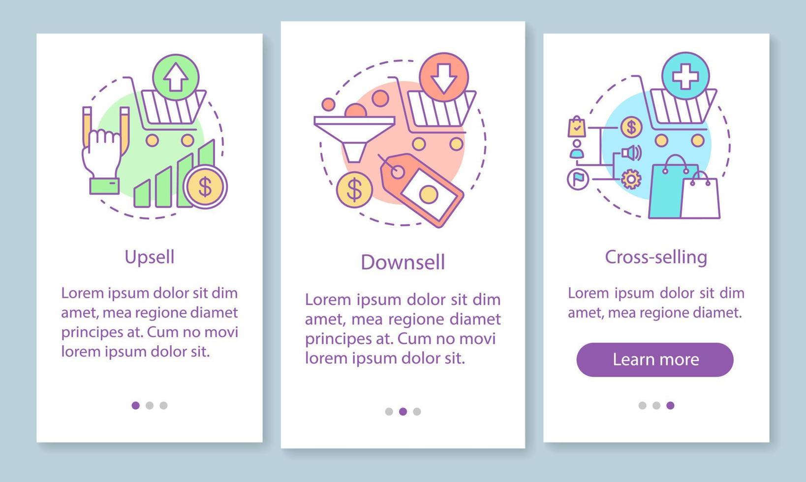 Sales onboarding mobile app page screen with linear concepts. Upsell, downsell walkthrough steps graphic instructions. Cross-selling. Income increasing. UX, UI, GUI vector template with illustrations Pro Vector