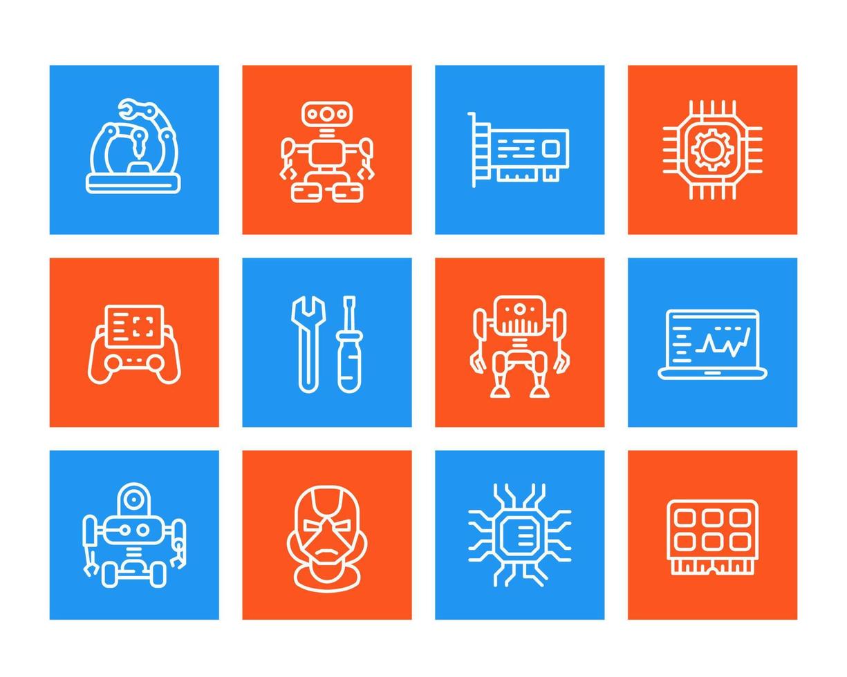 Robotics, mechanical engineering, robots linear icons set Pro Vector