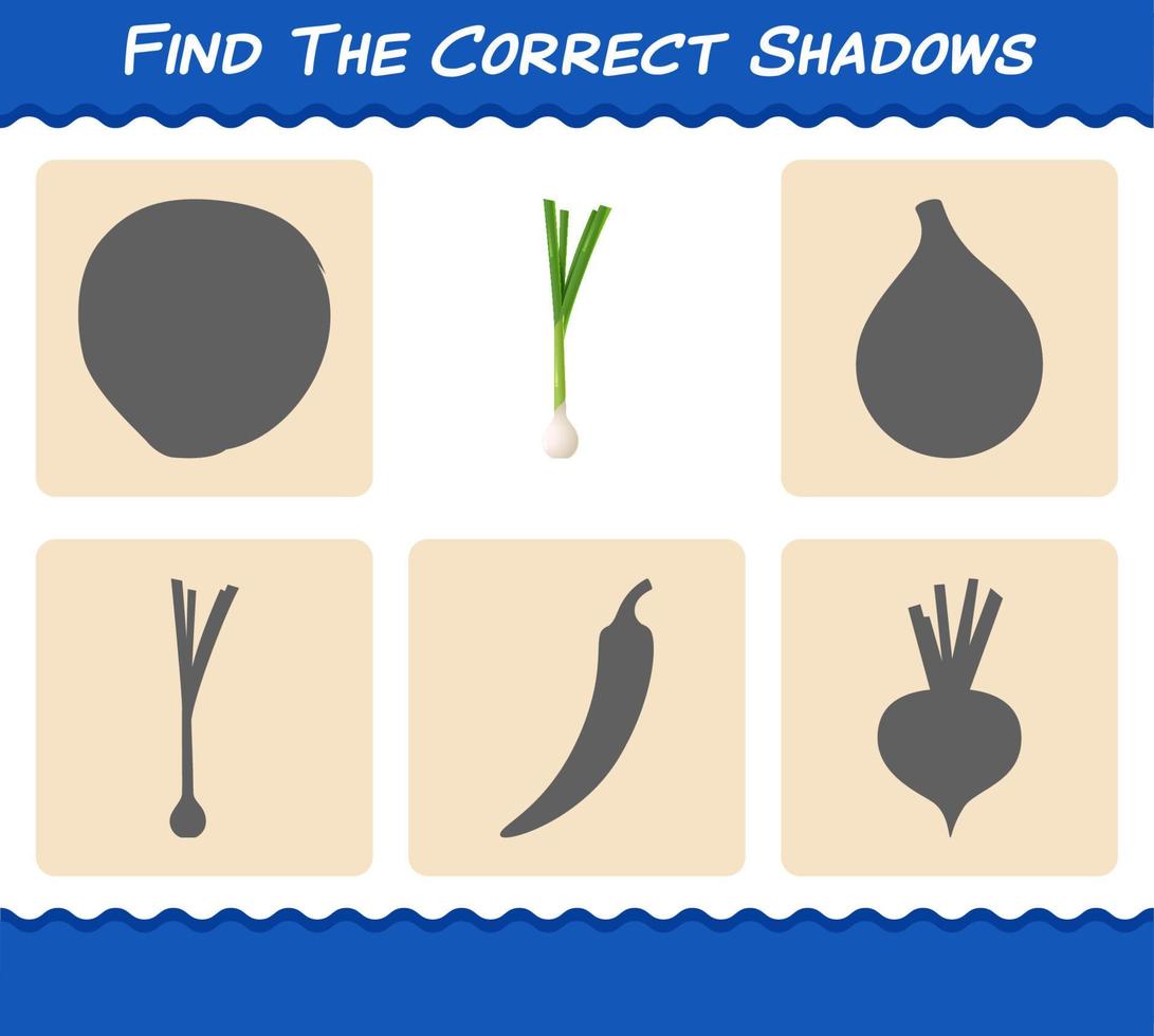 Find the correct shadows of cartoon spring onion. Searching and Matching game. Educational game for pre shool years kids and toddlers vector