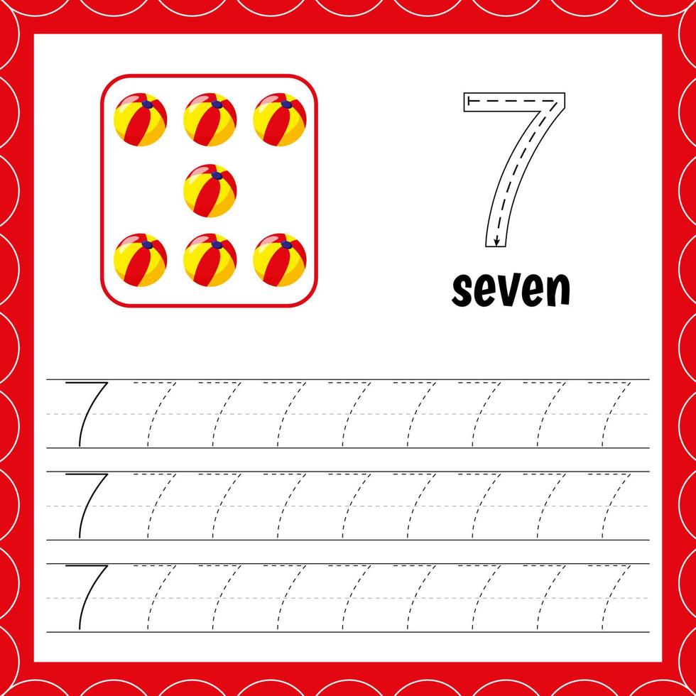 Cards with numbers for children. Trace the line. For kids learning. Count andwrite. Number seven. Count balls. Pro Vector