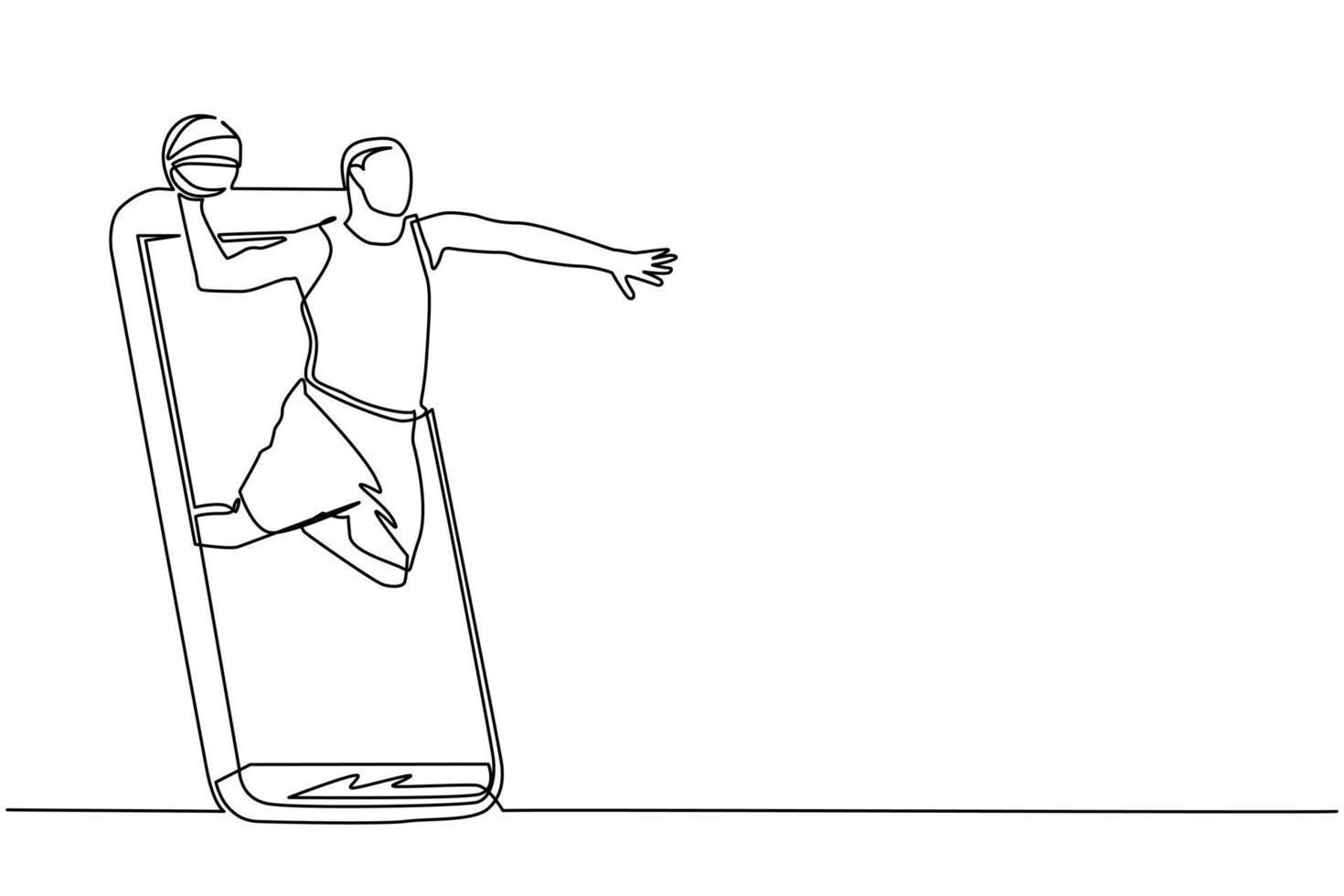 Single one line drawing basketball player jump and doing slam dunk ball out of smartphone screen. Online basketball game with live mobile app. Continuous line draw design graphic vector illustration Pro Vector