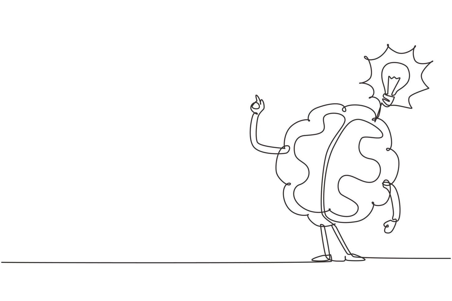Single one line drawing human brain invented something with bulb icon. Found the answer cartoon brain concept. Flat style design of brain for education. Continuous line draw design vector illustration Pro Vector