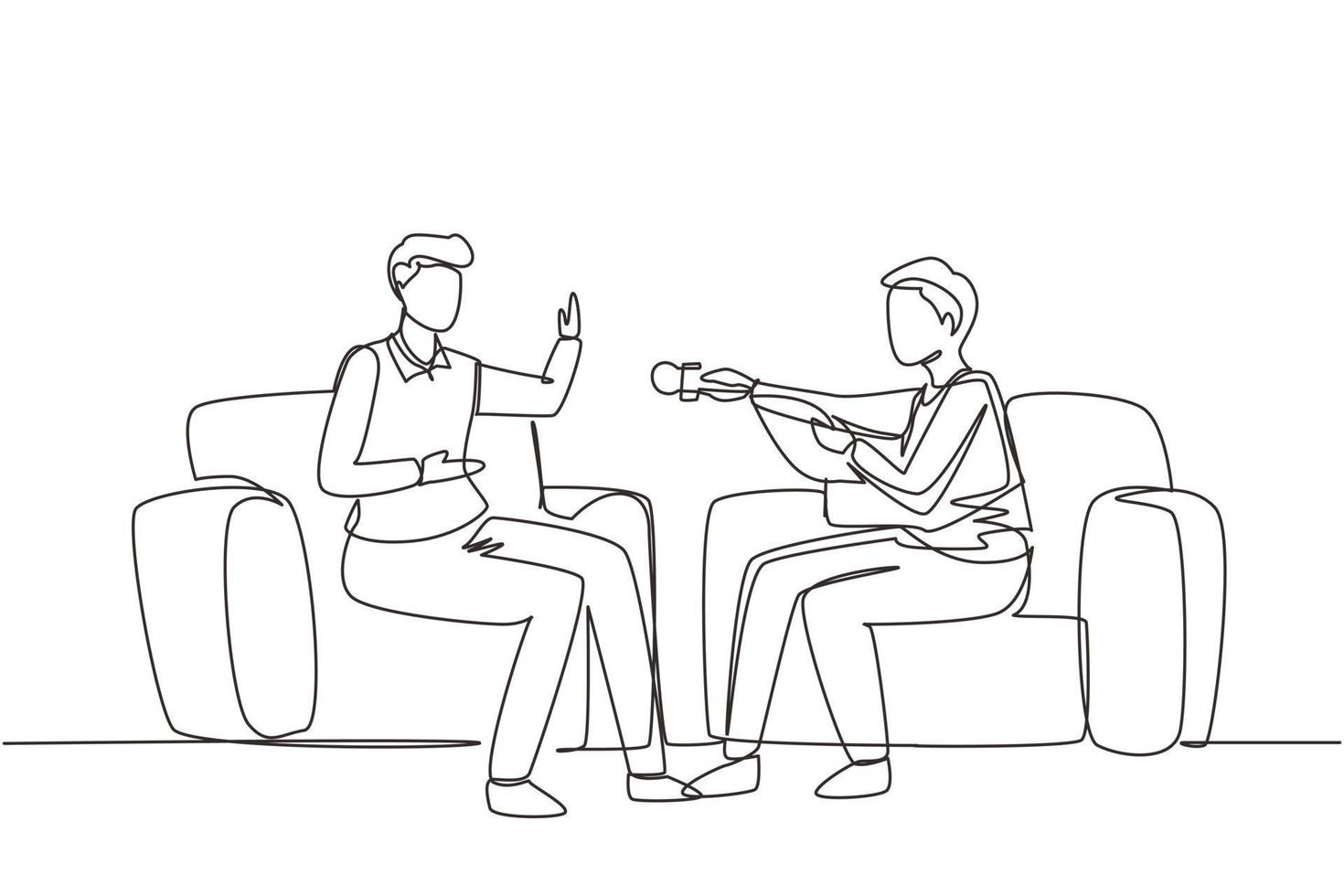 Single one line drawing Interview with famous person. Television or internet broadcast where a journalist talks to a celebrity. Journalist, interviewer. Continuous line draw design vector illustration Pro Vector