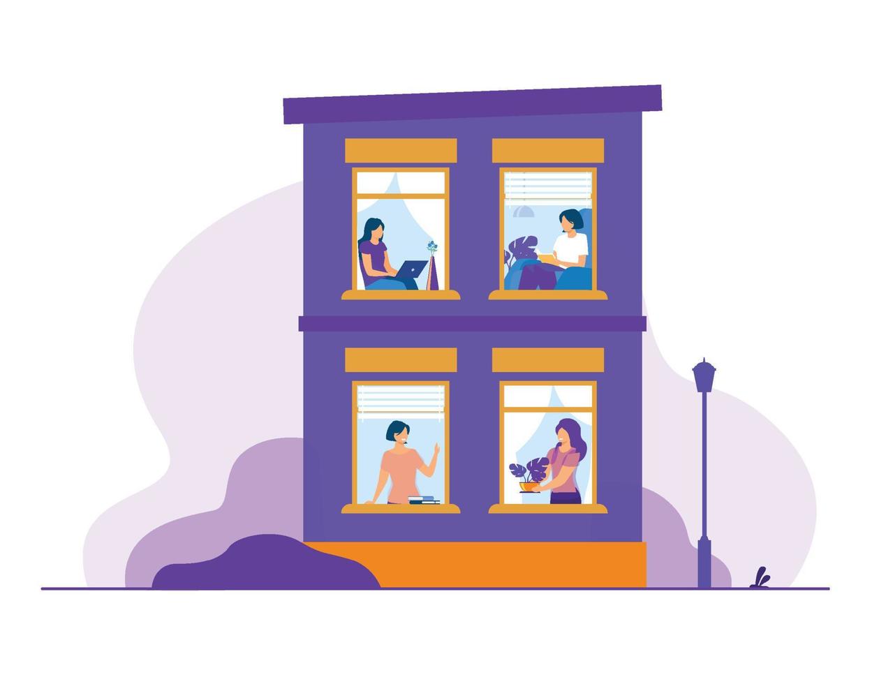Apartment building with people in open window spaces vector