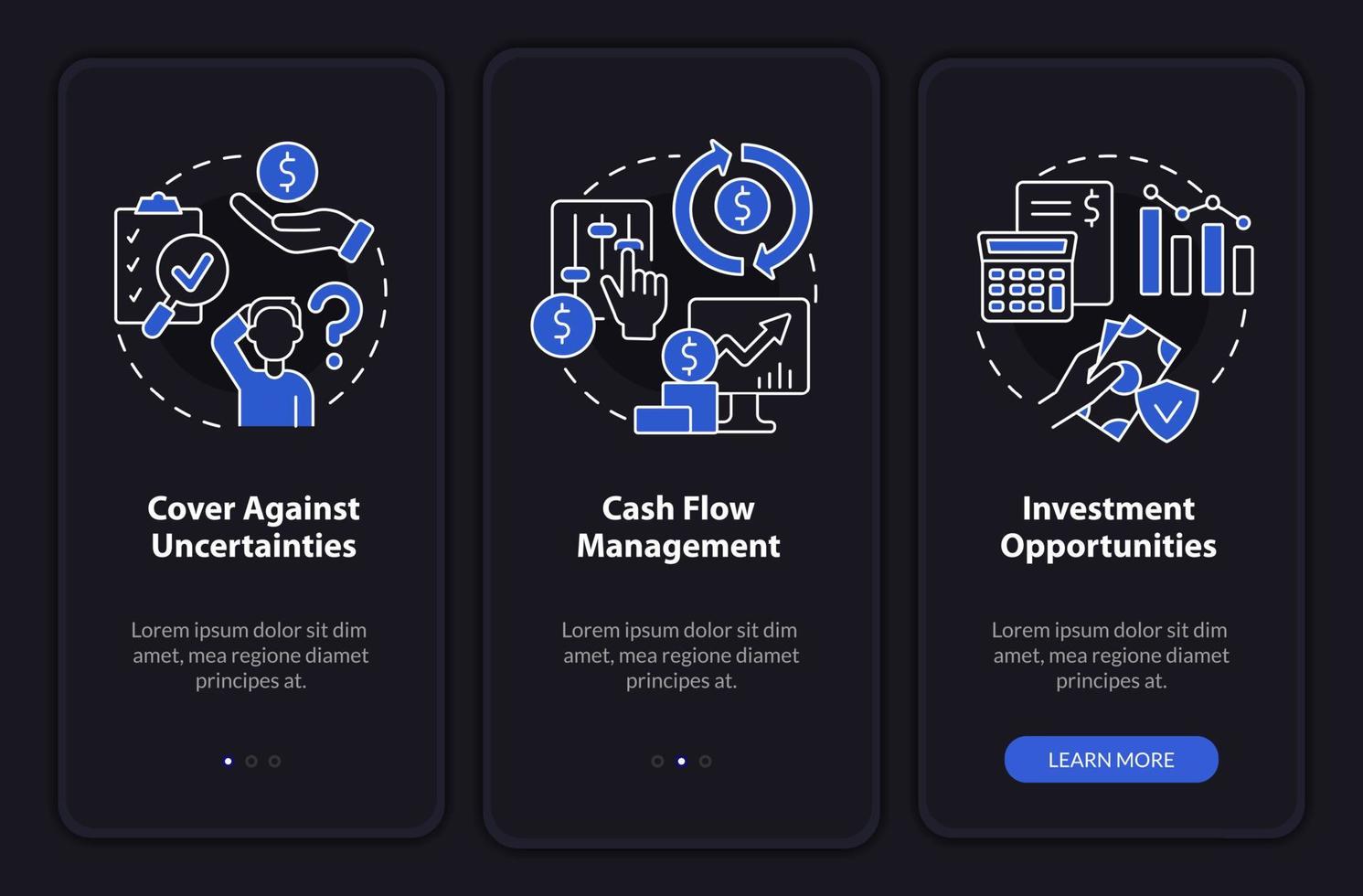 Benefits of insurance service night mode onboarding mobile app screen. Walkthrough 3 steps graphic instructions pages with linear concepts. UI, UX, GUI template. Pro Vector