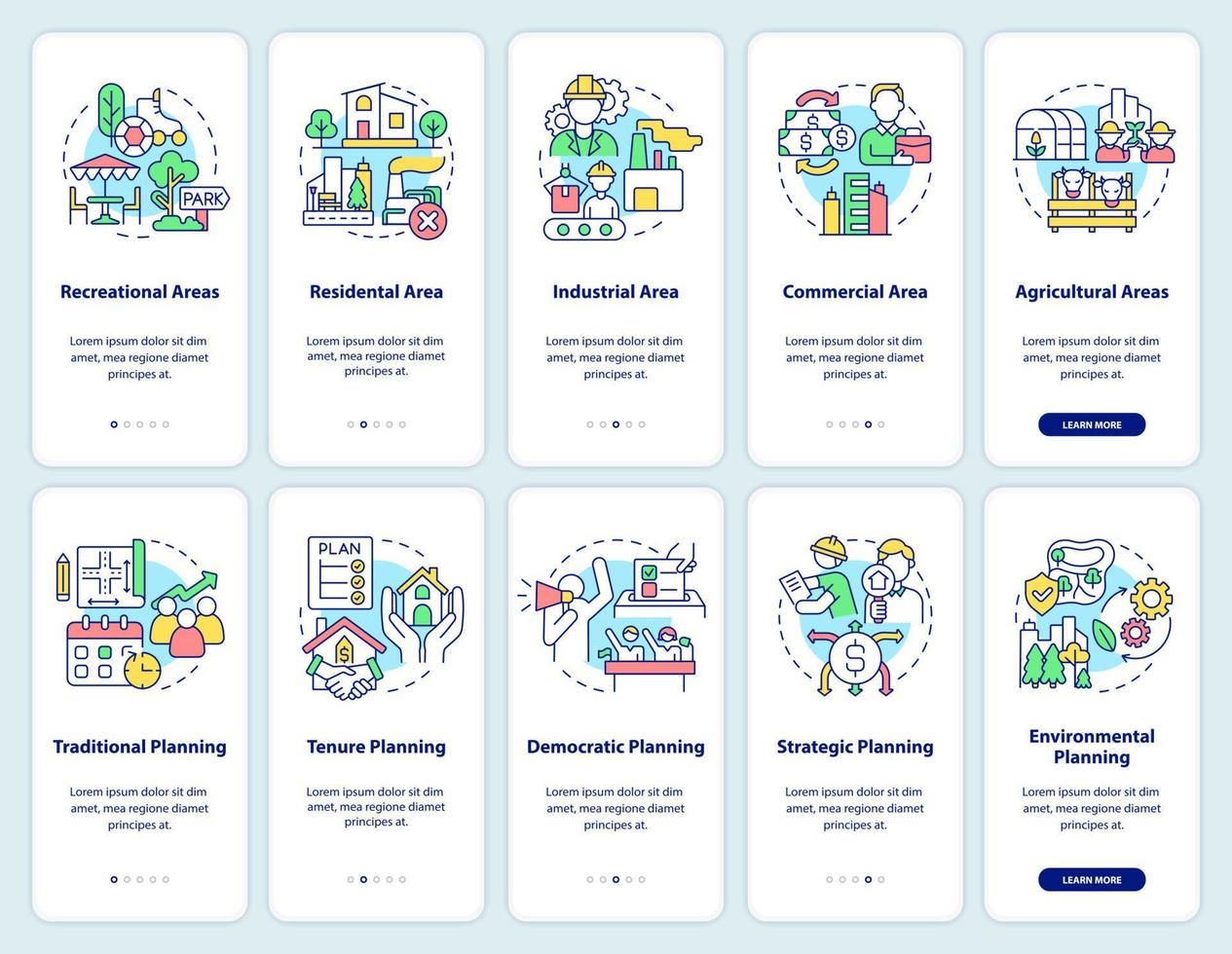 Land management onboarding mobile app screen set. Environmental planning walkthrough 5 steps graphic instructions pages with linear concepts. UI, UX, GUI template. Pro Vector