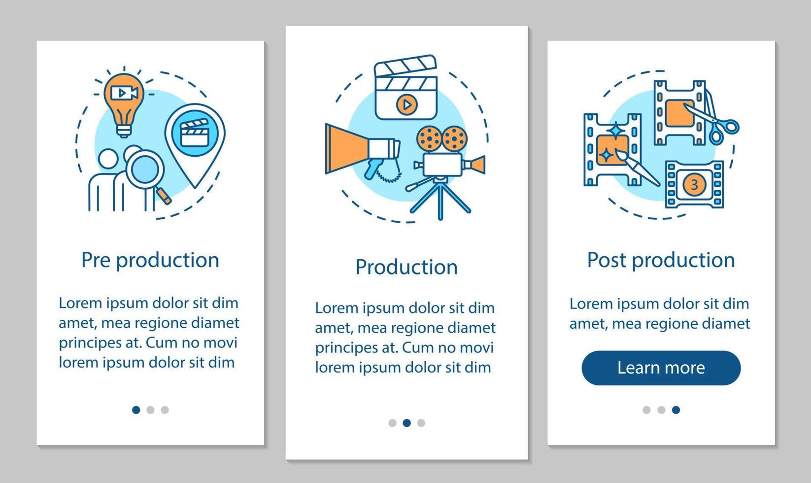 Video production onboarding mobile app page screen vector template. Film making process. Cinematography. Walkthrough website steps with linear illustrations. UX, UI, GUI smartphone interface concept Pro Vector