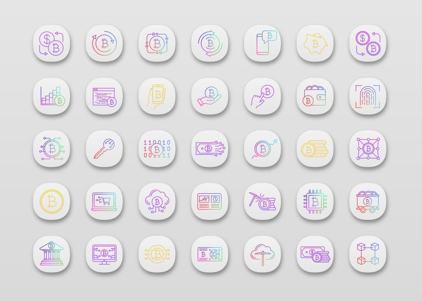 Bitcoin cryptocurrency app icons set. Digital money. Crypto currency. Mining business. Bitcoin trading. UI UX user interface. Web or mobile applications. Vector isolated illustrations Pro Vector