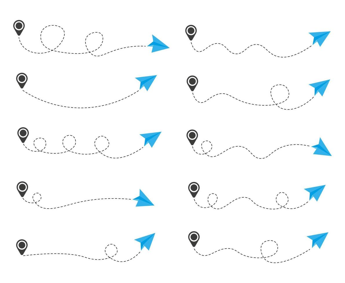 Set of Dashed Line Paper Airplane Route with Location Icon Pro Vector