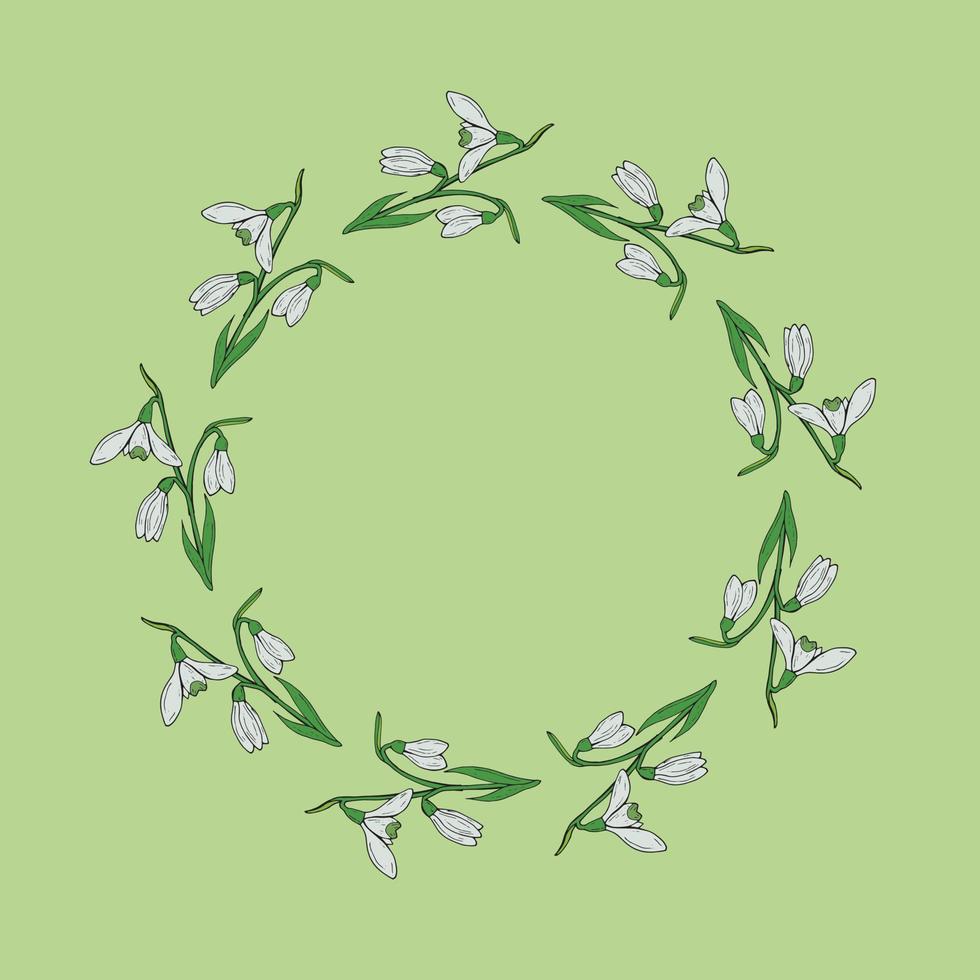 Round frame with horizontal lovely snowdrops on light green background. Isolated vector flowers pattern for your design. Pro Vector