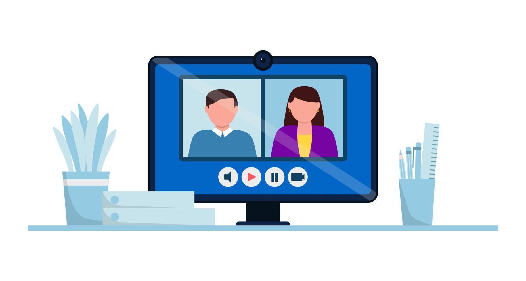 Online conference vector illustration. Job interview by web camera. Computer monitor with people on the screen Pro Vector