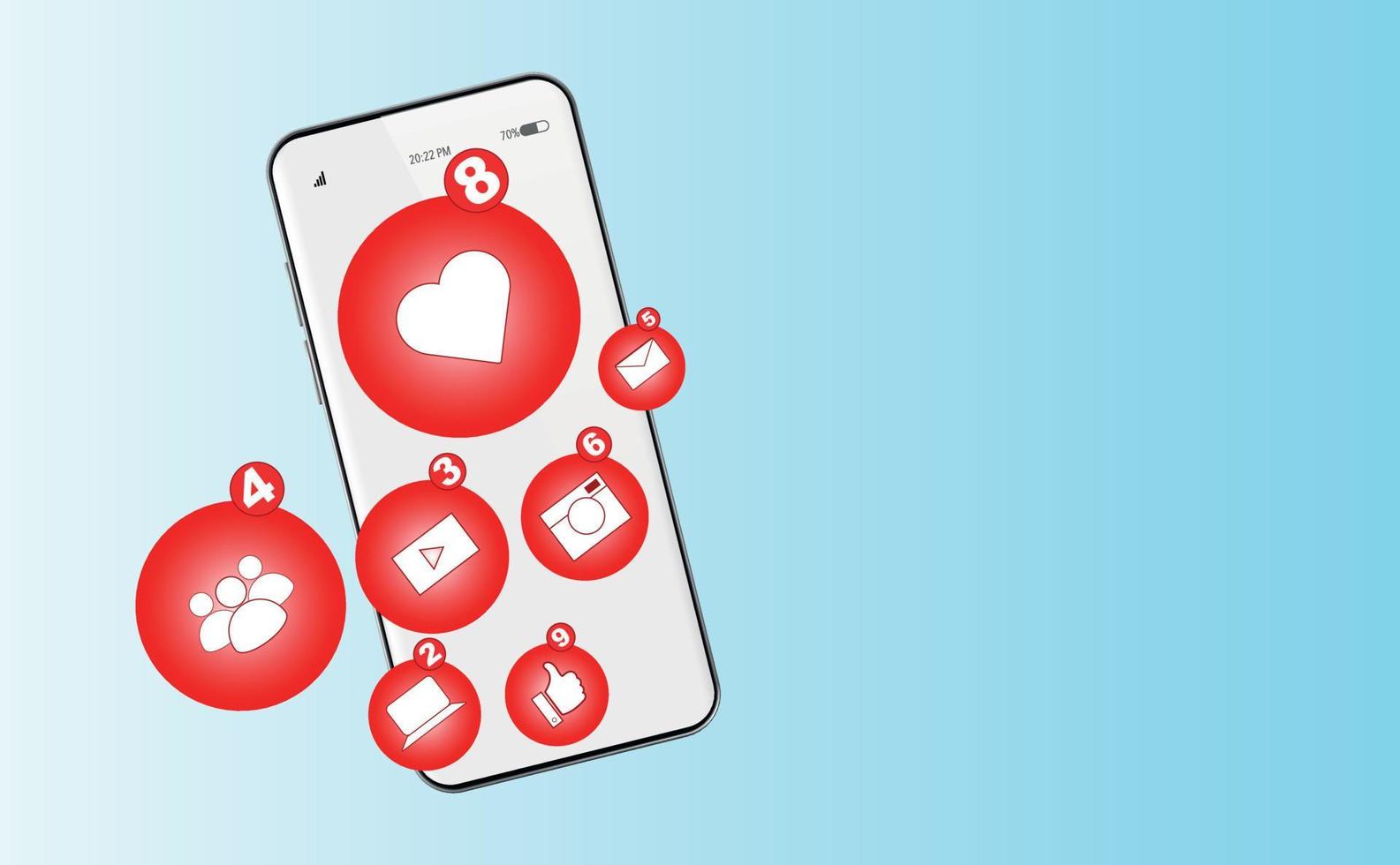 Social networks, smartphone with icons of hearts, likes, messages, groups in dialog pop-ups on a blue gradient background. Vector illustration Pro Vector