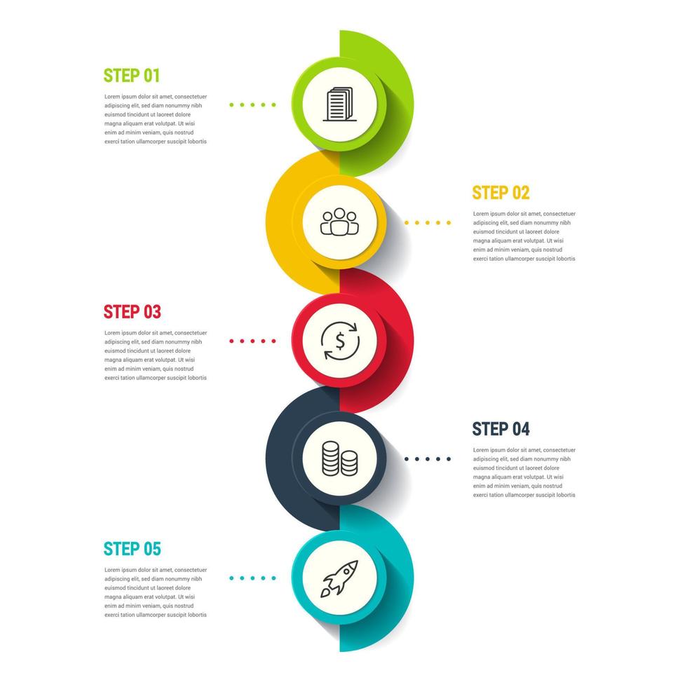 Business infographics desing template with icons and 5 steps. Can be used for workflow layout, diagram, annual report, web design. EPS 10. Pro Vector