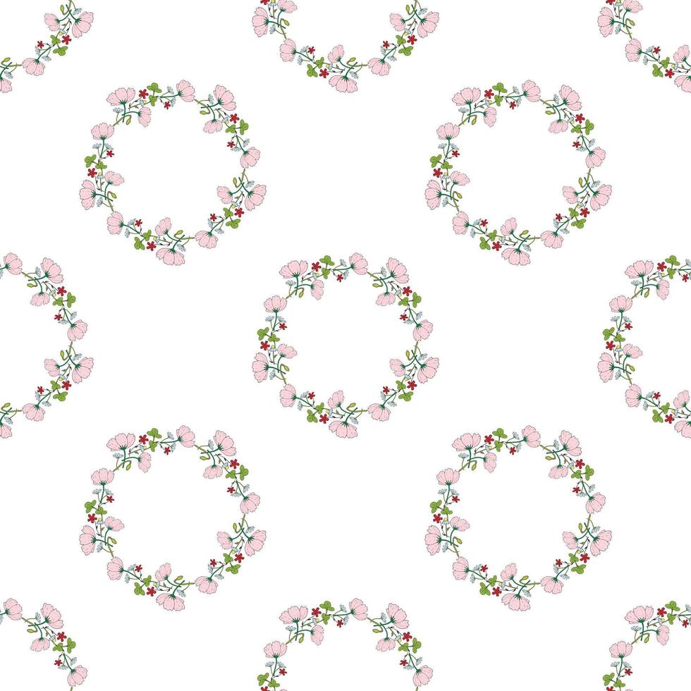 Seamless background with wreaths of of cosmos, clover, chamomile, carnation and poppy buds. Endless pattern for your design. Pro Vector