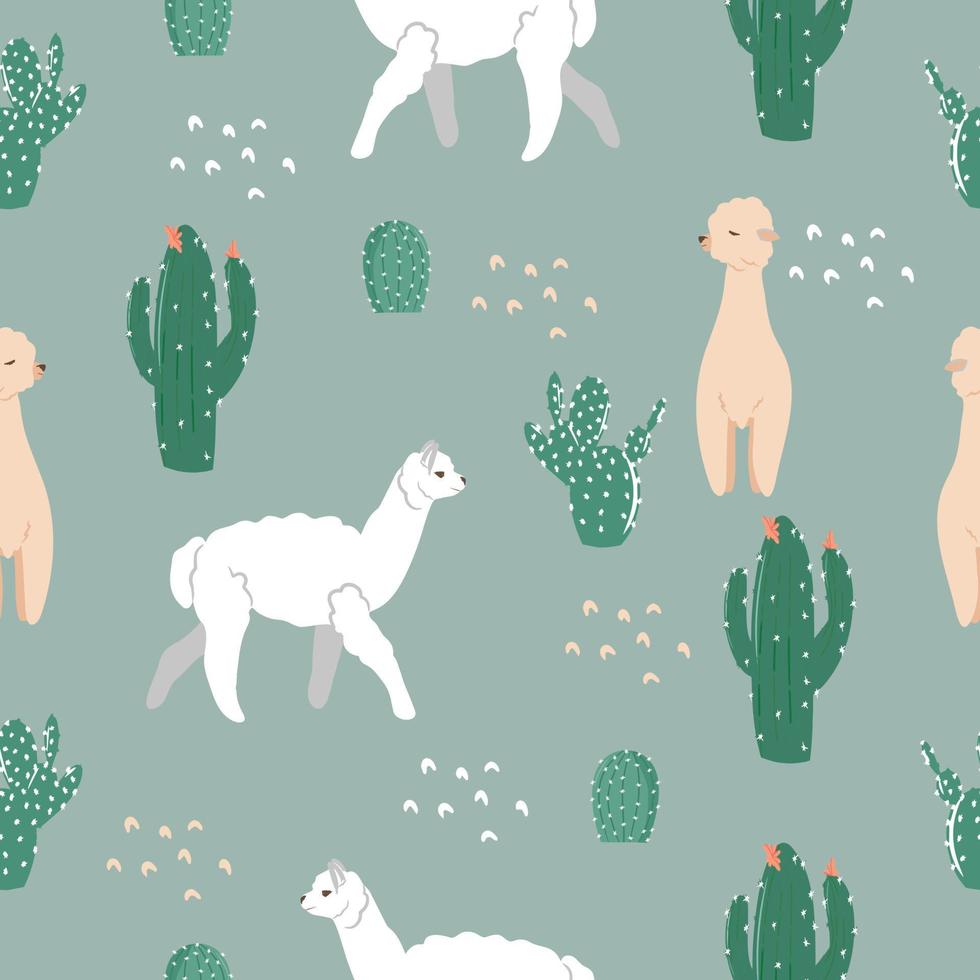 Seamless pattern with various cacti, bright texture with green cacti, hand drawing in cartoon style, stylish and simple illustration, background with desert plants, vector print for printing bedding Pro Vector