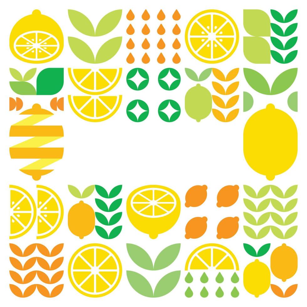 Minimalist flat vector frame, lemon fruit icon symbol. Simple geometric illustration of citrus, oranges, lemonade and leaves. Abstract design on black background. For copy space, social media posts. Pro Vector