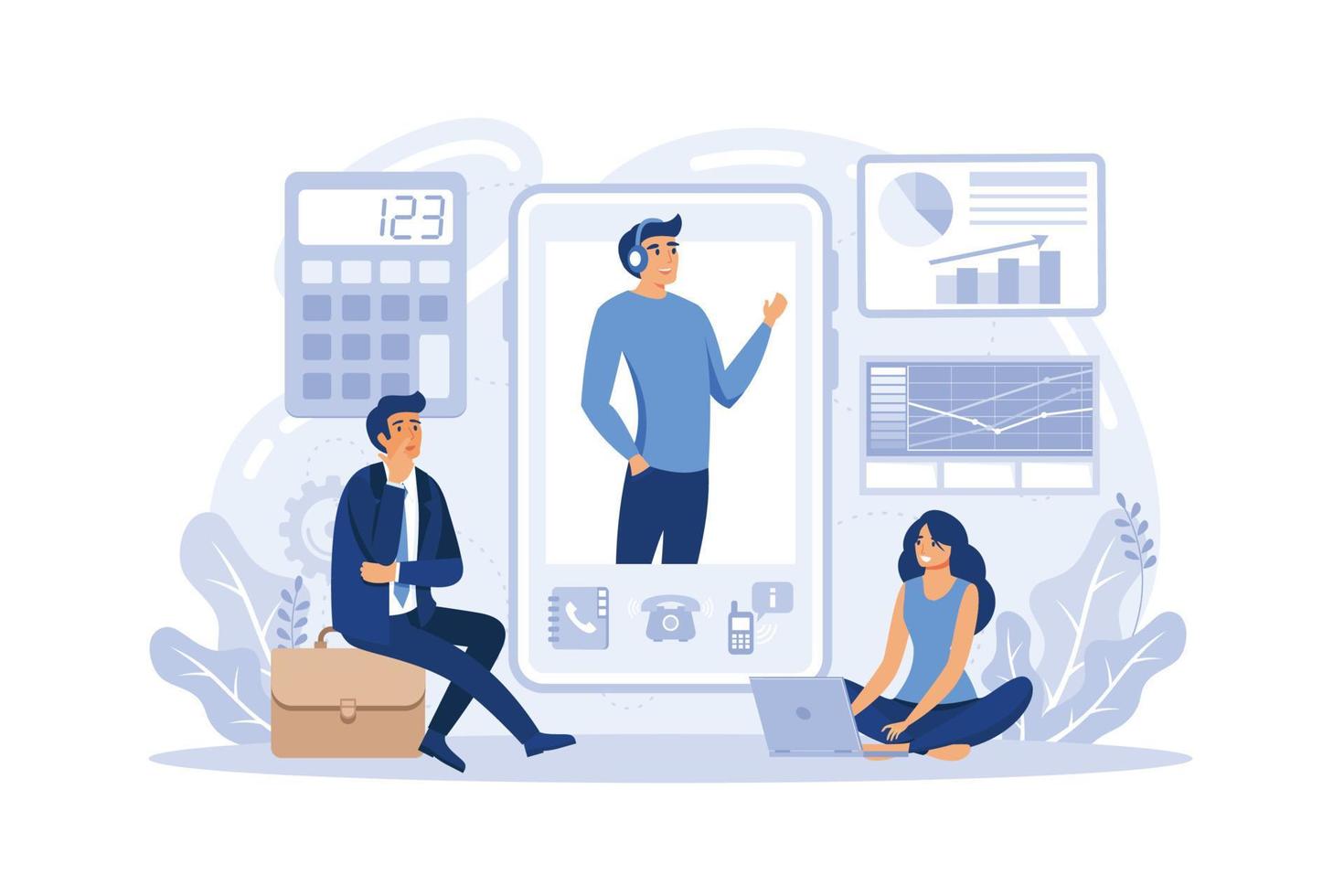Financial consultant online service or platform set. Business character analysing financial program for a company development. Online course, consultation, tutorial, website. Pro Vector
