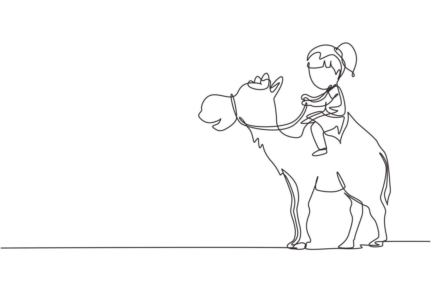 Single continuous line drawing happy little girl riding camel. Child sitting on hump camel with saddle in desert. Kids learning to ride camel. Dynamic one line draw graphic design vector illustration Pro Vector