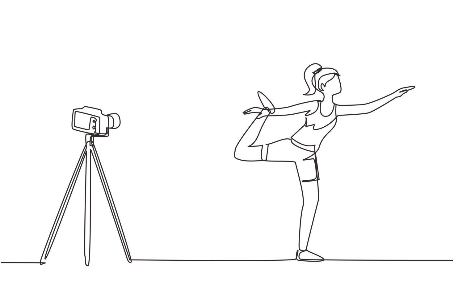Continuous one line drawing woman blogger in sportswear shoots video on camera doing exercises at home. Fitness vlogger live broadcast of training session. Single line draw design vector illustration Pro Vector