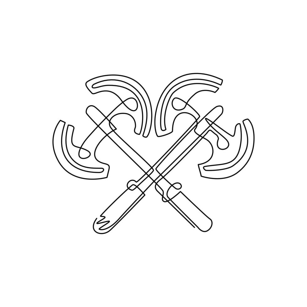 Single continuous line drawing two crossed broad axe, medieval axe, battle axe, executioner axe. Element for woodworking or lumberjack emblem or icon. One line draw graphic design vector illustration Pro Vector