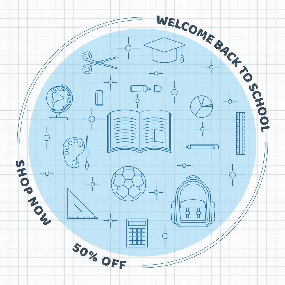 Back to school background with school elements in line art style on grid paper Pro Vector
