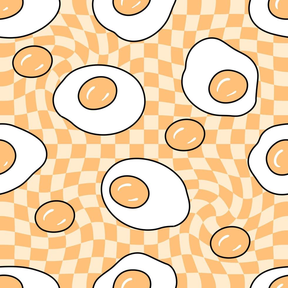 Doodle seamless pattern with fried eggs on trippy grid background. Pro Vector