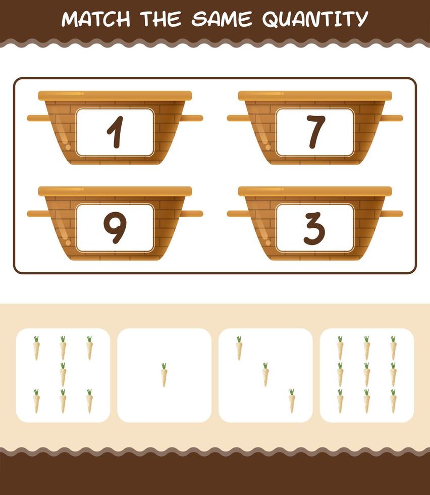 Match the same quantity of parsnip. Counting game. Educational game for pre shool years kids and toddlers vector